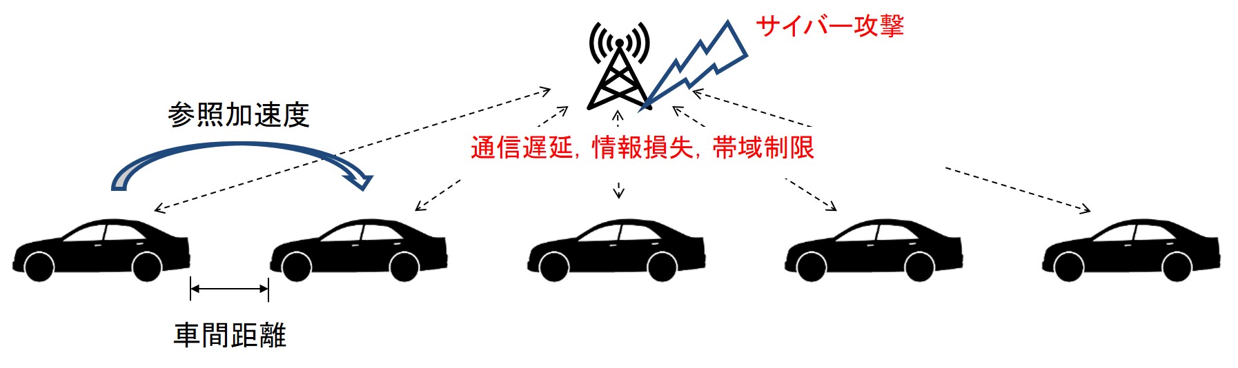 自動運転車両の協調型車間距離制御(CACC:Cooperative Adaptive Cruise Control)システムでは、無線通信を利用して前方車両から加速度情報を受け取り、各種センサ情報と合わせて自車両の制御を行うことで所望の車間距離を維持します。CACCは効率的な道路交通システムや省エネルギーな走行制御を実現するために必要不可欠な技術です。